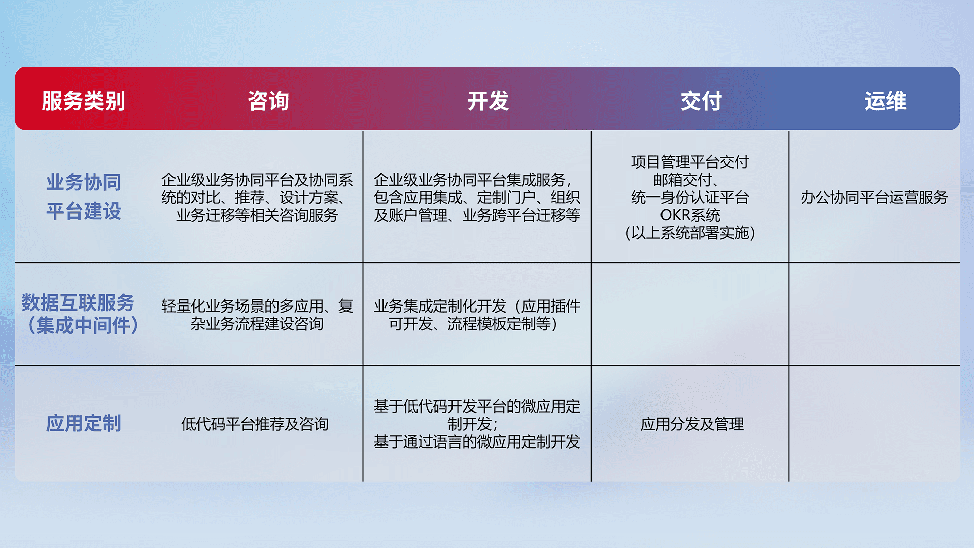针对钉钉、、、、企微、、、、IDaas等平台级产品提供产品的规划、、、、方案、、、交付、、、定制化开发等服务,,,实现如统一协同办公、、、智能客户服务、、混合会议管理、、智能数据查询、、、、等业务场景,,实现数字化转型。。。
